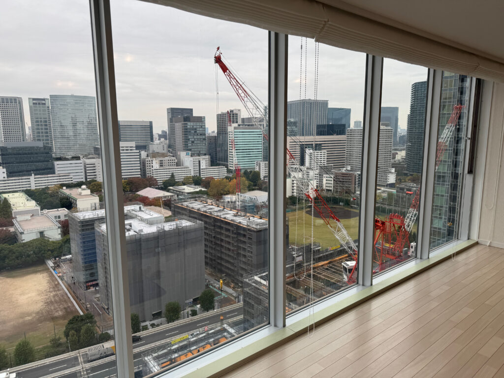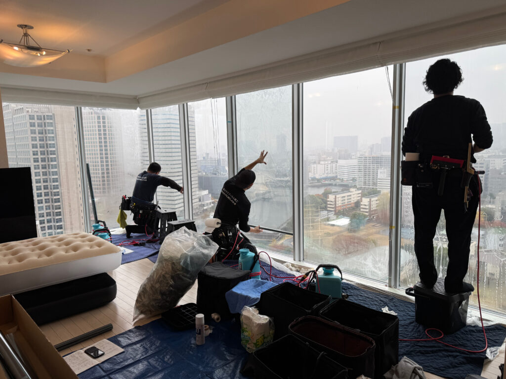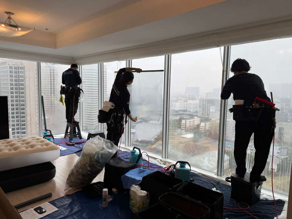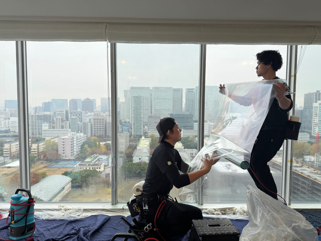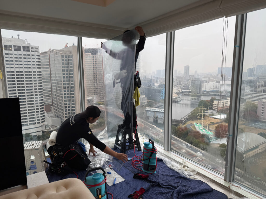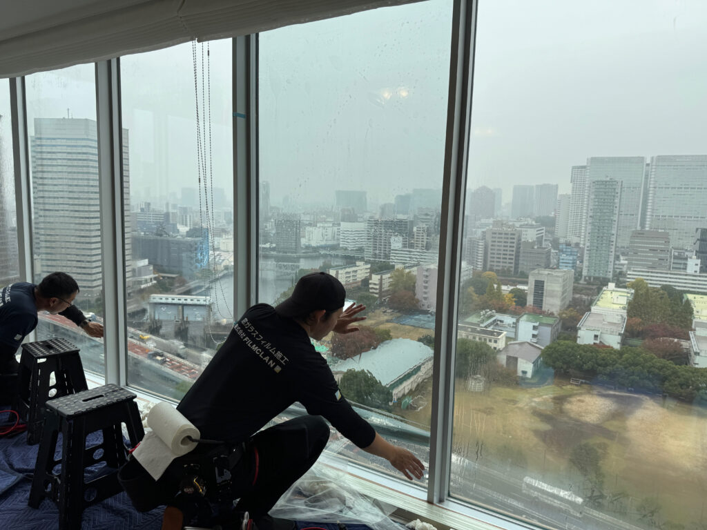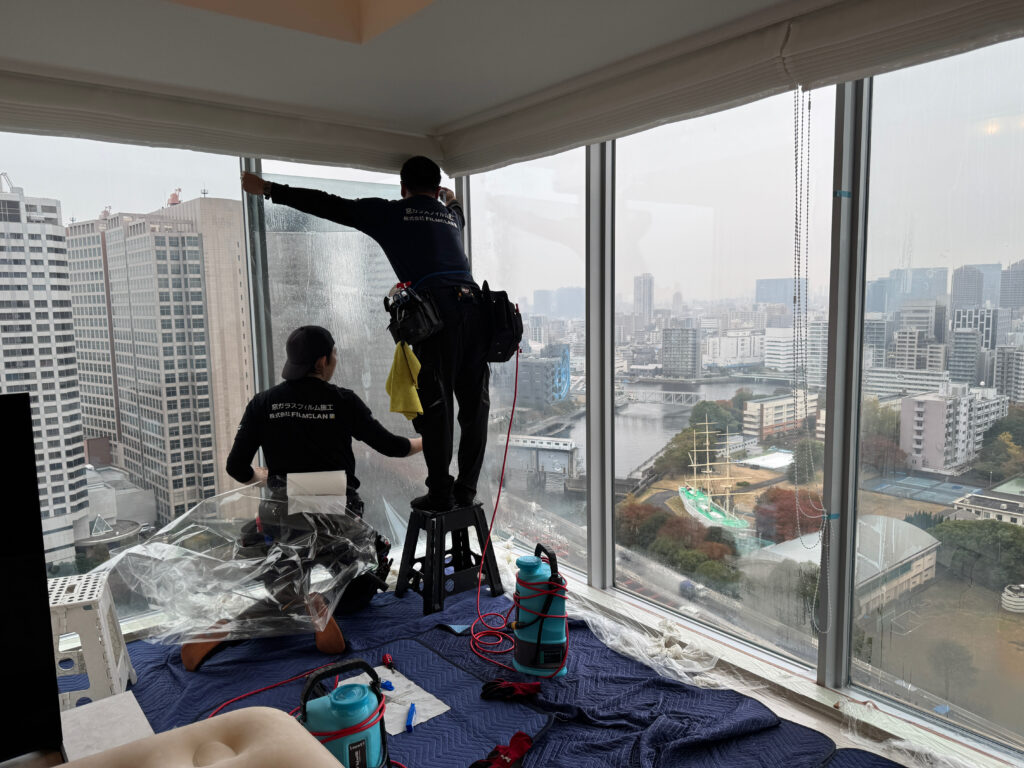 タワーマンション(港区)にて、10年ほど前に施工されていた遮熱フィルムの劣化が目立ち始めたため、貼り替え施工のご依頼をいただきました。高層階に住まわれる方の多くが大切にされている事は共通して「昼間はとてつもない暑さを少しでも和らげて、夜景が綺麗に見える事」です。遮熱フィルムのほとんどは夜になると室内側がガラスに映り込んで夜景が見えにくくなるタイプが多いのですが、このNANO70Sはとても多い遮熱フィルムの中で昼間は暑さを約39%カットして、眩しさも少し抑えて、それでいてガラスへの映り込みも少なく夜景が綺麗に見えるという高層階に最適な遮熱フィルムとなっています。