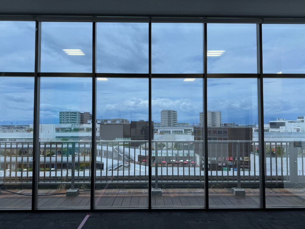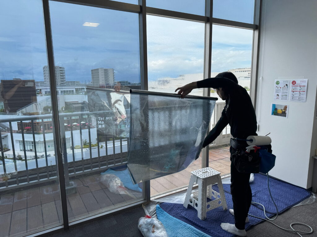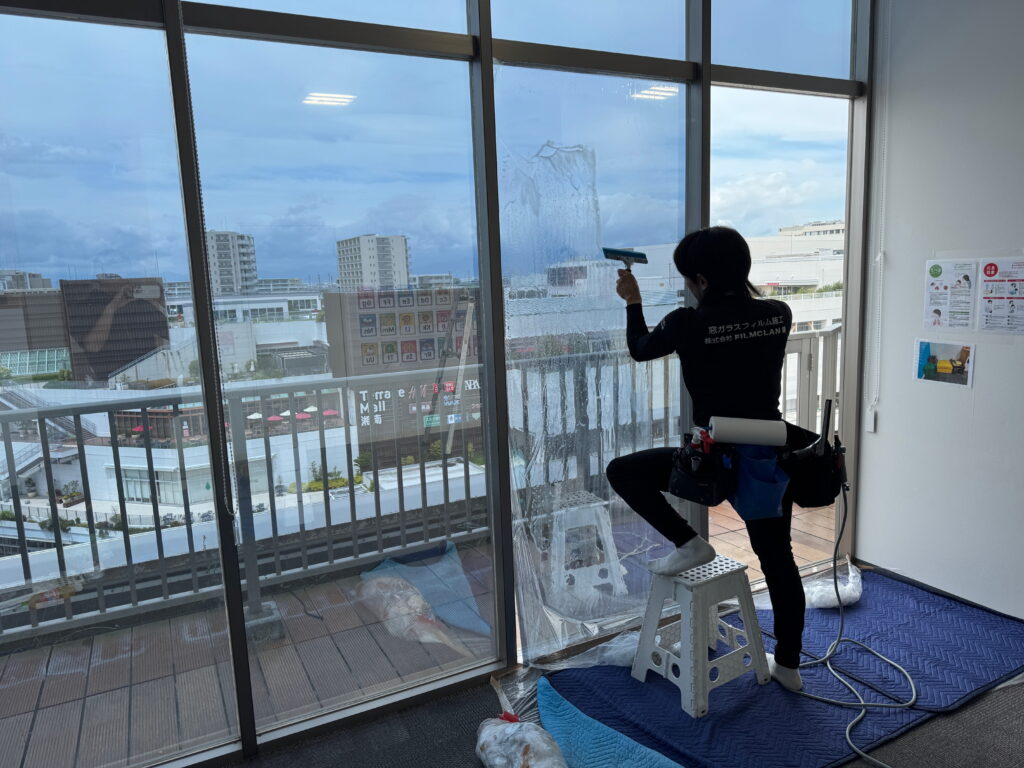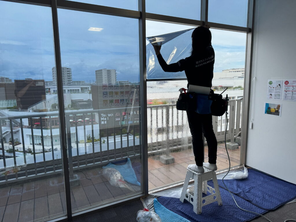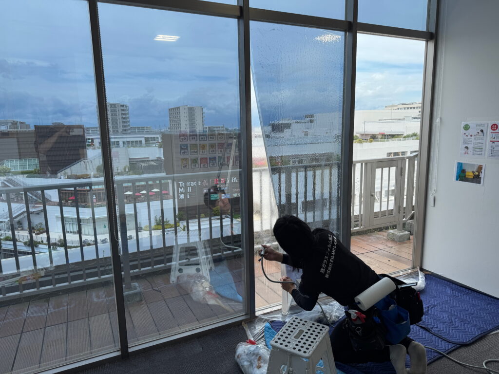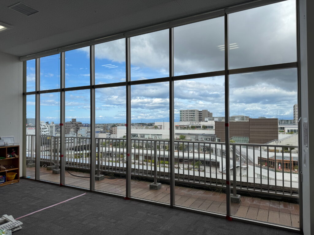 平塚市の大型ショッピングモール内テナントで営業されている保育園様で暑さ対策としてミラータイプの遮熱フィルムを施工させていただきました。園内は全面ガラス張りで冬でも強い陽射しが入るため、プライバシーを守りつつ強力な暑さ対策をしたいという事から最終的にシルバー遮熱15(RSP15)を施工するに至りました。