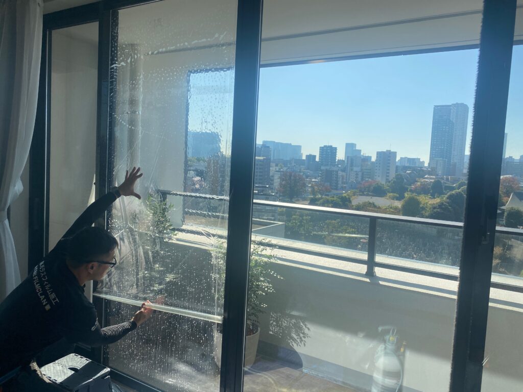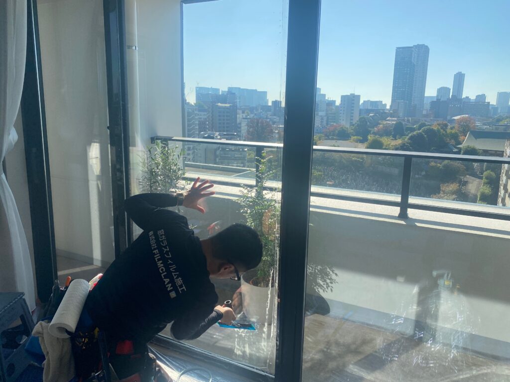 タワーマンション(港区)にお引越しされるお客様は当初「必要最低限の安全対策」としてオプション販売でも推奨されていた「UVカットフィルム」を検討されていらっしゃいました。多くの業者様では「UVカットフィルム」と称している事が多いのですが、そのほとんどが正式には安全対策のための「飛散防止フィルム」と言います。この飛散防止フィルムには必要最低限のUVカット効果が備わっている事からUVカットフィルムと言える事も事実ではありますが、UVカット目的である場合には効果が期待できません。今回は安全対策という事である事から飛散防止フィルムSN50を施工するに至りましたがUVカット目的である場合はまた別のフィルムを推奨しています。