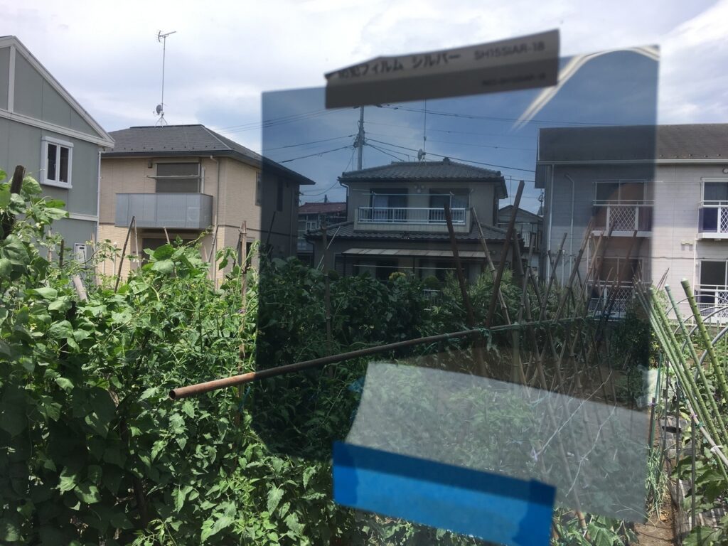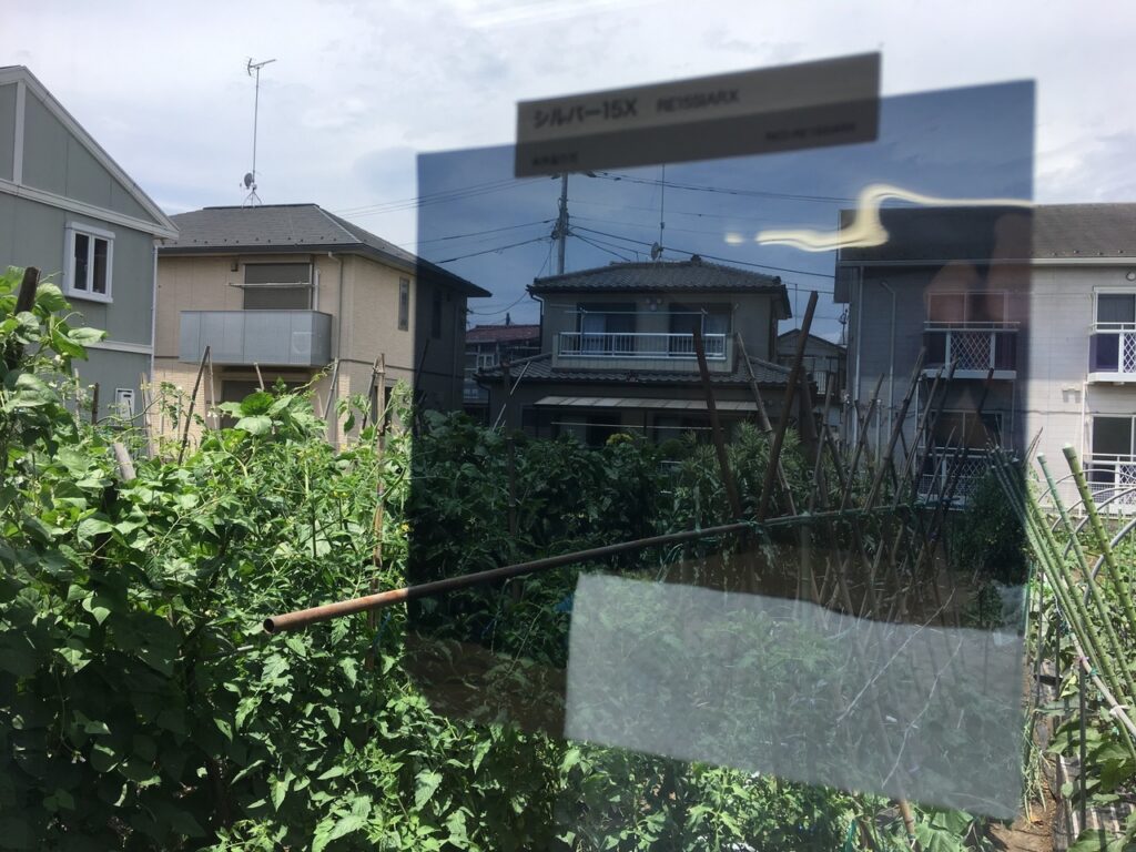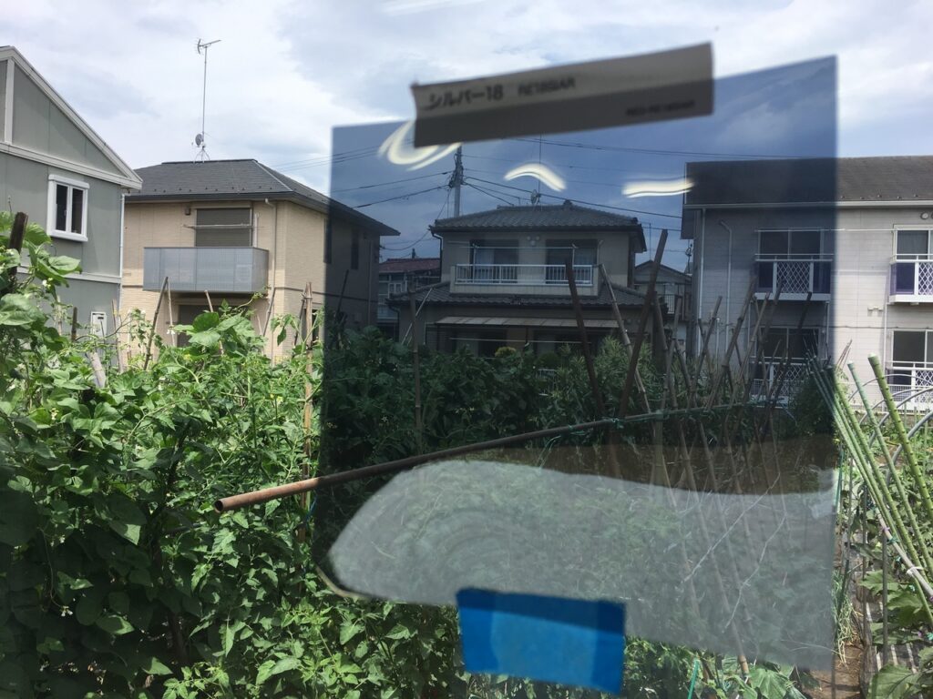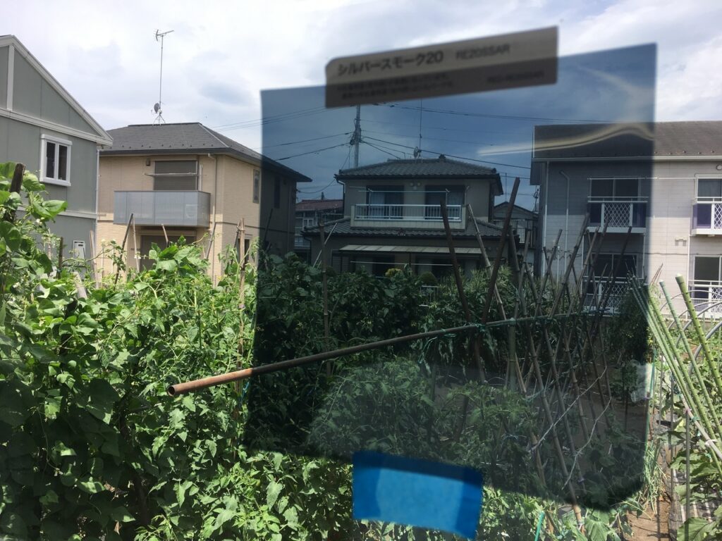 屋内側から貼る事が出来ない場合に屋外側から貼れるミラー効果による目隠しに期待できる遮熱フィルムです。